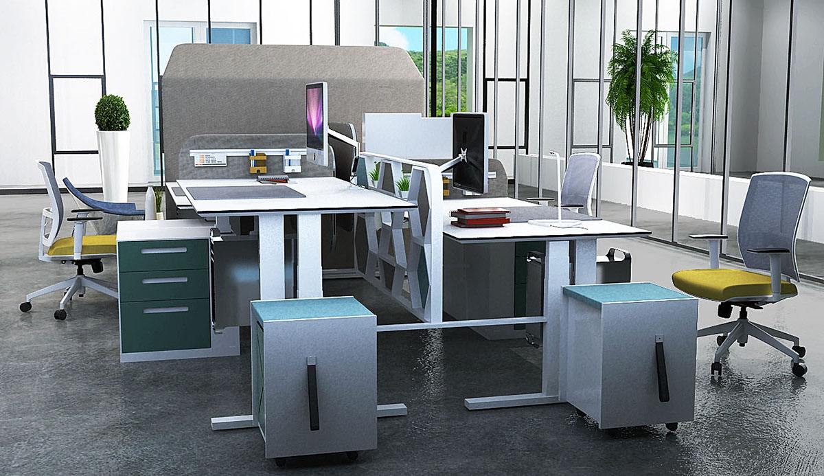 (可升降卡位)1.可站立工作,適合不同身高員工使用。2.價格相對高 3.市場售出量較少, 4.維修難度大 5.空間視覺感自由,凌亂